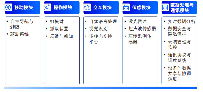 模塊化設計通過將機器人系統(tǒng)分解為多個軟硬 件模塊 ,廠商和用戶可以根據(jù)不同的應用需求 進行靈活組合和定制。這一設計理念不僅提升 了產(chǎn)品的適應性和可擴展性 ,還為技術的創(chuàng)新 與產(chǎn)品的迭代提供了可能性 ,是開放性的全棧 式智能服務機器人生態(tài)系統(tǒng)的基石。服務機器 人模塊化設計以多個軟硬件模塊——移動模 塊、操作模塊、交互模塊、傳感模塊和數(shù)據(jù)處 理與通信模塊為核心。通過這種靈活的設計, 服務機器人能夠大大提升在不同場景中能夠靈活應對復雜任務的能力。