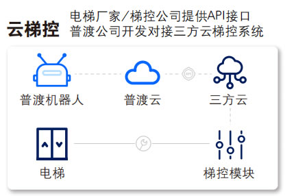 云梯控通過云端API接口與電梯控制系統(tǒng)進行 數(shù)據(jù)交互。服務機器人可以通過網絡訪問電 梯操作系統(tǒng),而無需對電梯進行任何硬件改 造。這一過程依賴于云計算平臺的實時處理 和數(shù)據(jù)分析能力。云梯控的優(yōu)勢在于不需要 改造電梯,通過API接口實現(xiàn)機器人乘梯;兼 容性G,可以供不同類型的服務機器人在同 一個場景共同乘梯 ;功能實現(xiàn)靈活,可通過 電梯接口去實現(xiàn)不同乘梯需求。