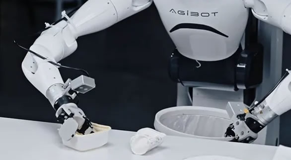 2)視覺+觸覺下,靈巧手準(zhǔn)確執(zhí)行酒杯和酒瓶的抓握,雙臂+雙手協(xié)同完成倒酒操作。 同樣在家用場景中,智元機器人可實現(xiàn)一手將日用品放入被另一只手提著的手提袋內(nèi), 協(xié)同效應(yīng)較好;同時,揀取桌面不同位置的垃圾并置于垃圾桶中。