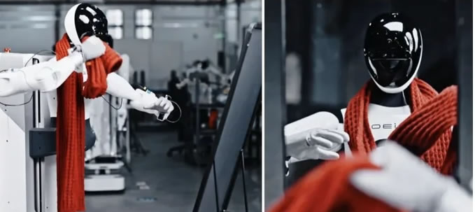 1)機器人保持動作柔順性與位姿穩(wěn)定性,雙手靈巧配合,可以完成具有生物運動特征的圍巾佩戴任務(wù),先模型通過觀察鏡子中圍巾和頭的相對位置,完成圍巾的初始佩戴, 然后根據(jù)兩側(cè)的長度比例,左手準(zhǔn)確的握住需要調(diào)整的一端,將其拉到適當(dāng)?shù)奈恢茫? 后右手接過左手遞過來的圍巾執(zhí)行“圍”的螺旋纏繞動作。