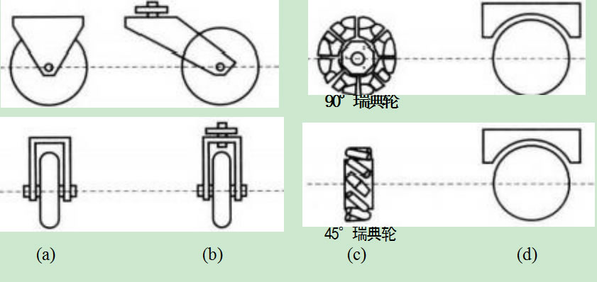 如圖2-1-2所示,機(jī)器人上所用的車輪可以分為四大類:D一大類是在輪式移 動機(jī)器人中得到廣泛使用的常用車輪,如圖2-1-2(a) 所示,其結(jié)構(gòu)與我們常見的 車輪相同,稱為標(biāo)準(zhǔn)輪,它有兩個自由度,分別是圍繞輪軸和接觸點(diǎn)的轉(zhuǎn)動;第二類 為小腳輪,如圖2-1-2(b) 所示,它有三個自由度,圍繞垂直軸的轉(zhuǎn)動、圍繞偏移的 輪軸和接觸點(diǎn)的轉(zhuǎn)動;第三類為瑞典輪,通常稱為全方位車輪,如圖2-1-2(c) 所示, 從該類車輪側(cè)向視圖可看出,其車輪外緣布置的輥?zhàn)虞S線與車輪軸線具有一定夾 角。這種車輪也有三個自由度,圍繞輪軸、輥?zhàn)雍徒佑|點(diǎn)的轉(zhuǎn)動;第四類為球形輪, 如圖2-1-2(d) 所示,這種車輪可以沿任何方向受動力而旋轉(zhuǎn),但在技術(shù)實(shí)現(xiàn)上比 其他輪子要困難一些。
