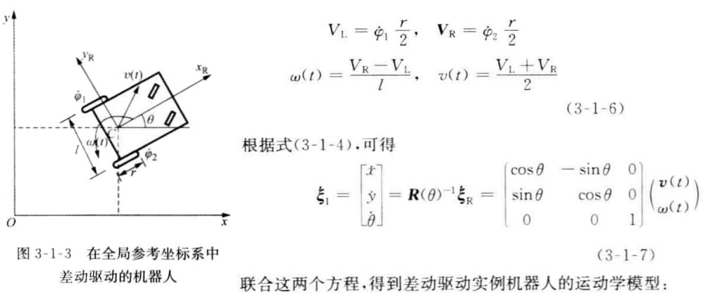 先,我們討論如圖3-1-3所示的雙輪差速驅(qū)動的移動機(jī)器人的運動學(xué)模型, 即討論給定機(jī)器人的幾何特征和它的輪子速度后,機(jī)器人的運動方程。