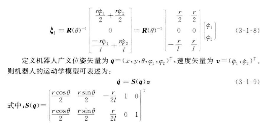 假定機(jī)器人在運動中質(zhì)心的線速度為v(t), 角速度為w(t), 左右兩輪的轉(zhuǎn)速分別為ψ和 中₂,機(jī)器人左右兩輪的運動速度分別為 VI, VR。給定r,1,θ, 以及根據(jù)圖3-1-3所示的幾 何關(guān)系,考慮到移動機(jī)器人滿足剛體運動規(guī) 律,下面的運動學(xué)方程(3-1-6)成立。