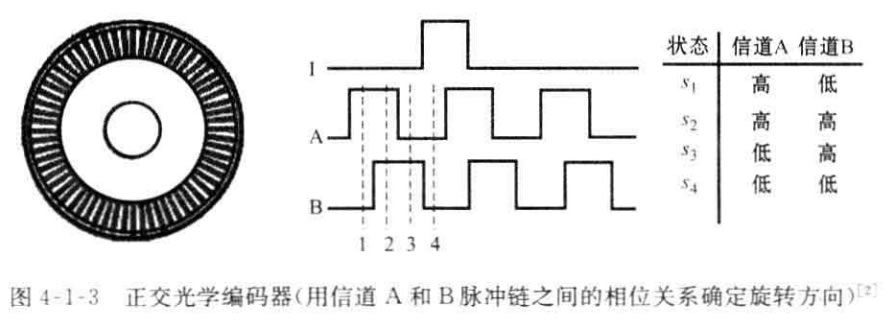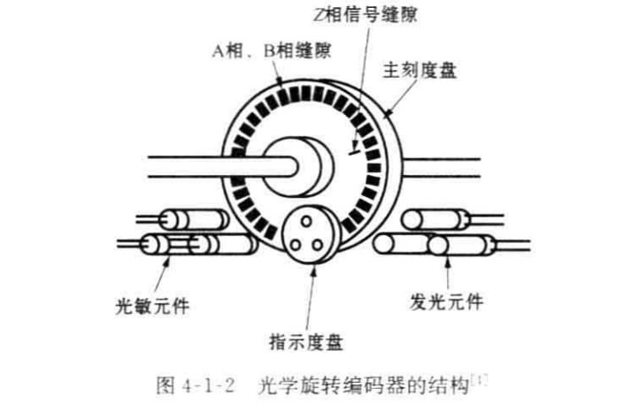 以圖4-1-2為例說(shuō)明光學(xué)編碼器的結(jié)構(gòu)。光學(xué)編碼器由發(fā)光元件、屏蔽光的固 定光柵、與轉(zhuǎn)軸一起旋轉(zhuǎn)的帶光柵的轉(zhuǎn)盤和固定的光敏元件組成。發(fā)光元件和光敏 元件安放在碼盤的兩側(cè),當(dāng)轉(zhuǎn)盤轉(zhuǎn)動(dòng)時(shí),根據(jù)固定的和運(yùn)動(dòng)的光柵的排列,光敏元件 接收的光通量會(huì)發(fā)生變化。光敏元件輸出的波形經(jīng)過(guò)整形后形成脈沖,根據(jù)脈沖計(jì) 數(shù),可以得到固定在碼盤上的轉(zhuǎn)軸的角位移。在測(cè)量中,Z后得到的光強(qiáng)信號(hào)用閾 值變換成離散的方波,在亮和暗的狀態(tài)之間作選擇。分辨率以每轉(zhuǎn)周期數(shù)(CPR)度量。Z小的角分辨率可以容易地從編碼器的CPR 額定值計(jì)算出。典型的編碼 器可擁有2000 CPR, 而光學(xué)編碼器工業(yè)可容易地制造出具有10000 CPR 的 編 碼 器。當(dāng)然,根據(jù)所需的帶寬,Z關(guān)鍵的是編碼器需要足夠快,以計(jì)算期望的軸轉(zhuǎn)速。