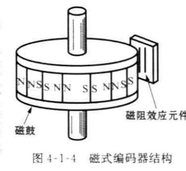 磁式編碼器是通過(guò)在強(qiáng)磁性材料表面上等 間隔的磁化刻度標(biāo)尺,標(biāo)尺旁邊相對(duì)放置磁阻 效應(yīng)元件或霍爾元件,即能檢測(cè)磁通的變化,如 圖4-1-4所示,兩個(gè)磁傳感器的距離恰好是磁化 標(biāo)尺間隔的1/4. 因此可以根據(jù)輸出信號(hào)的相位 關(guān)系檢測(cè)旋轉(zhuǎn)方向。與光學(xué)編碼器相比,磁式編 碼器的刻度間隔大,但它具有耐油污、抗沖擊等 特點(diǎn)。