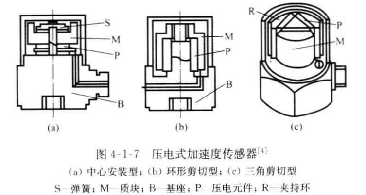 常用的壓電式加速度計(jì)的結(jié)構(gòu)形式如圖4-1-7所示。圖中(a) 是安裝壓 縮型,壓電元件 一質(zhì)量塊 一 彈簧系統(tǒng)裝在圓形中心支柱上,支柱與基座連接。這種 結(jié)構(gòu)有高的共振頻率。然而基座B 與測(cè)試對(duì)象連接時(shí),如果基座 B 有變形則將直 接影響拾振器輸出。此外,測(cè)試對(duì)象和環(huán)境溫度變化將影響壓電元件,并使預(yù)緊力 發(fā)生變化,易引起溫度漂移。圖(c) 為三角剪切形,壓電元件由夾持環(huán)將其夾牢在 三角形中心柱上。加速度計(jì)感受軸向振動(dòng)時(shí),壓電元件承受切應(yīng)力。這種結(jié)構(gòu)對(duì) 底座變形和溫度變化有極好的隔離作用,有較高的共振頻率和良好的線性。圖(b) 為環(huán)形剪切型,結(jié)構(gòu)簡(jiǎn)單,能做成極小型、高共振頻率的加速度計(jì),環(huán)形質(zhì)量塊粘到 裝在中心支柱上的環(huán)形壓電元件上。由于粘結(jié)劑會(huì)隨溫度增高而變軟,因此Z高 工作溫度受到限制。