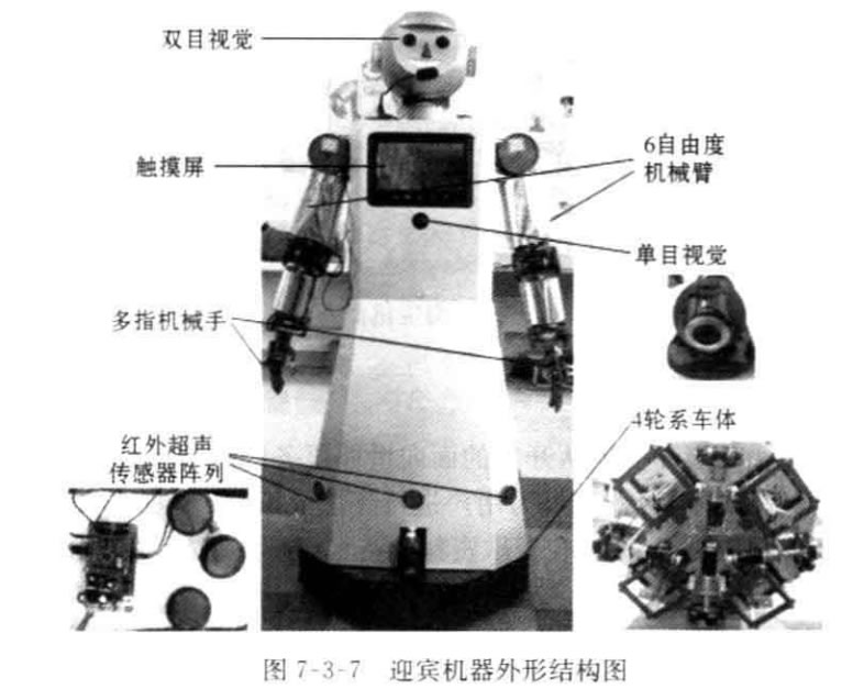 迎賓機(jī)器人采用造型活潑的卡通形象,其外形如圖7-3-7所示,頭部有雙目視覺(jué)傳感器,身體部分主要包括觸摸屏、機(jī)械臂和機(jī)械手。身高約1.4~1.5m, 采 用 輪式移動(dòng)方式,Z高移動(dòng)速度約18m/min 。 可自主完成接待、導(dǎo)引、語(yǔ)音提示、點(diǎn) 菜等服務(wù)工作。連續(xù)工作時(shí)間不小于2小時(shí)。主要參數(shù)如下: