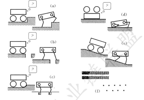 腿式運(yùn)動(dòng)以一系列機(jī)器人和地面之間的點(diǎn)接觸為特征。其主要優(yōu)點(diǎn)包括在粗糙地形上(圖2.5)的自適應(yīng)性和機(jī)動(dòng)性。因?yàn)橹恍枰唤M點(diǎn)接觸,所以只要機(jī)器人能夠 保持適當(dāng)?shù)牡孛嬲麧嵍龋@些點(diǎn)之間的地面質(zhì)量是無關(guān)緊要的。另外,只要行走機(jī)器 人的步距大于洞穴的寬度,它就能跨越洞穴或者裂口。腿式運(yùn)動(dòng)的Z后一個(gè)優(yōu)點(diǎn)是, 能用高度的技巧來操縱環(huán)境中的物體。舉一個(gè)精彩的昆蟲例子,即甲殼蟲,它用靈巧 的前肢在運(yùn)動(dòng)的同時(shí)能夠滾動(dòng)一個(gè)球。