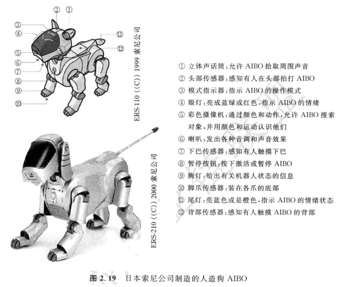 盡管四腿站立不動(dòng)是無(wú)源穩(wěn)定的,但要行走仍具有挑戰(zhàn)性。因?yàn)樵诓叫衅陂g,為 了保持穩(wěn)定,機(jī)器人的重心需要主動(dòng)地偏移。Z近,索尼投資數(shù)百萬(wàn)美元開發(fā)一個(gè)叫作AIBO的四腿機(jī)器人(圖2.19)。為了制作這個(gè)機(jī)器人,索尼開發(fā)了近實(shí)時(shí)的新的 機(jī)器人操作系統(tǒng)和新的嚙合伺服電機(jī)。它具有足夠大的力矩以支持機(jī)器人,還是可 后向驅(qū)動(dòng)的以保證安全。除了開發(fā)專用的電機(jī)和軟件之外,索尼公司還插入了一個(gè) 彩色視覺(jué)系統(tǒng),使AIBO 能夠追逐一個(gè)色彩鮮艷的球。在需要再充電之前,機(jī)器人至 多能工作一個(gè)小時(shí)。該機(jī)器人初期銷量曾經(jīng)很旺,D一年就賣了60000多臺(tái)?墒, 這臺(tái)機(jī)器狗所用的電機(jī)的數(shù)量和技術(shù)投資,使得它的售價(jià)高達(dá)約1500美元。