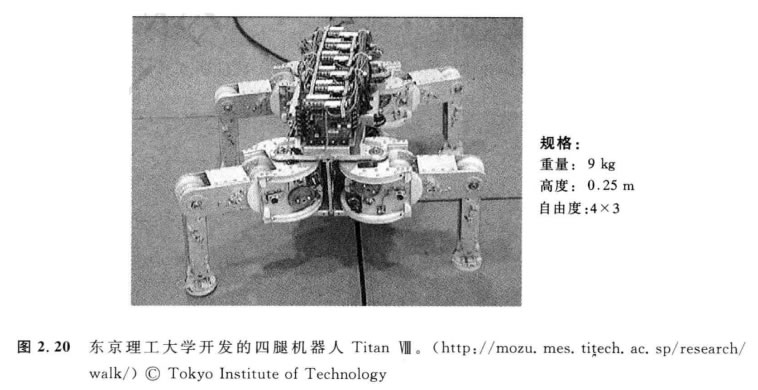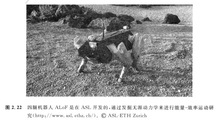 另一個(gè)四腿機(jī)器人的例子是ALoF, 該機(jī)器人是在ASL(蘇黎世瑞士聯(lián)邦理工大學(xué))開 發(fā)的(圖2.22)。它被當(dāng)作一個(gè)平臺(tái),研究能量-效率運(yùn)動(dòng)。這是通過(guò)發(fā)掘無(wú)源動(dòng)力學(xué)來(lái)進(jìn) 行的,其方法如同2.2.2節(jié)所闡述的一樣,它在雙腳機(jī)器人中被證明是有效的。