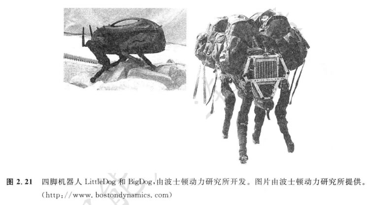 BigDog 和LittleDog(圖2.21)是四腳機(jī)器人的Z新例子,它們是受美國(guó)國(guó)防先 進(jìn)研究項(xiàng)目局(DARPA) 委托,由波士頓動(dòng)力研究所開發(fā)的機(jī)器人。BigDog是一個(gè) 粗糙地形的機(jī)器人,能夠走、跑、爬,并運(yùn)載重負(fù)荷。它由一個(gè)發(fā)動(dòng)機(jī)和驅(qū)動(dòng)液壓激勵(lì)系統(tǒng)提供動(dòng)力。它的腿像動(dòng)物一樣與適從元件相連,吸收振動(dòng),并在二步之間循環(huán)能 量。該項(xiàng)目的目的,是使機(jī)器人能夠去人和動(dòng)物能夠去的任何地方。這個(gè)項(xiàng)目由 DARPA 的戰(zhàn)術(shù)技術(shù)辦公室資助。相反,LittleDog是一個(gè)小尺寸的機(jī)器人,它是為研究學(xué)習(xí)運(yùn)動(dòng)而設(shè)計(jì)的。它的每條腿具有大的運(yùn)動(dòng)范圍,并由3個(gè)電機(jī)供能量。所以, 這個(gè)機(jī)器人在爬行和動(dòng)態(tài)運(yùn)動(dòng)步態(tài)方面,具有足夠強(qiáng)的功能。