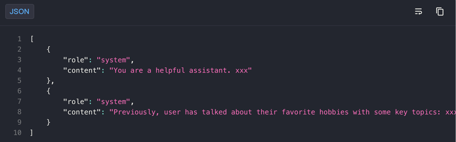 以下示例展示了通過 system_messages 注入經(jīng)過總結(jié)的記憶內(nèi)容:
