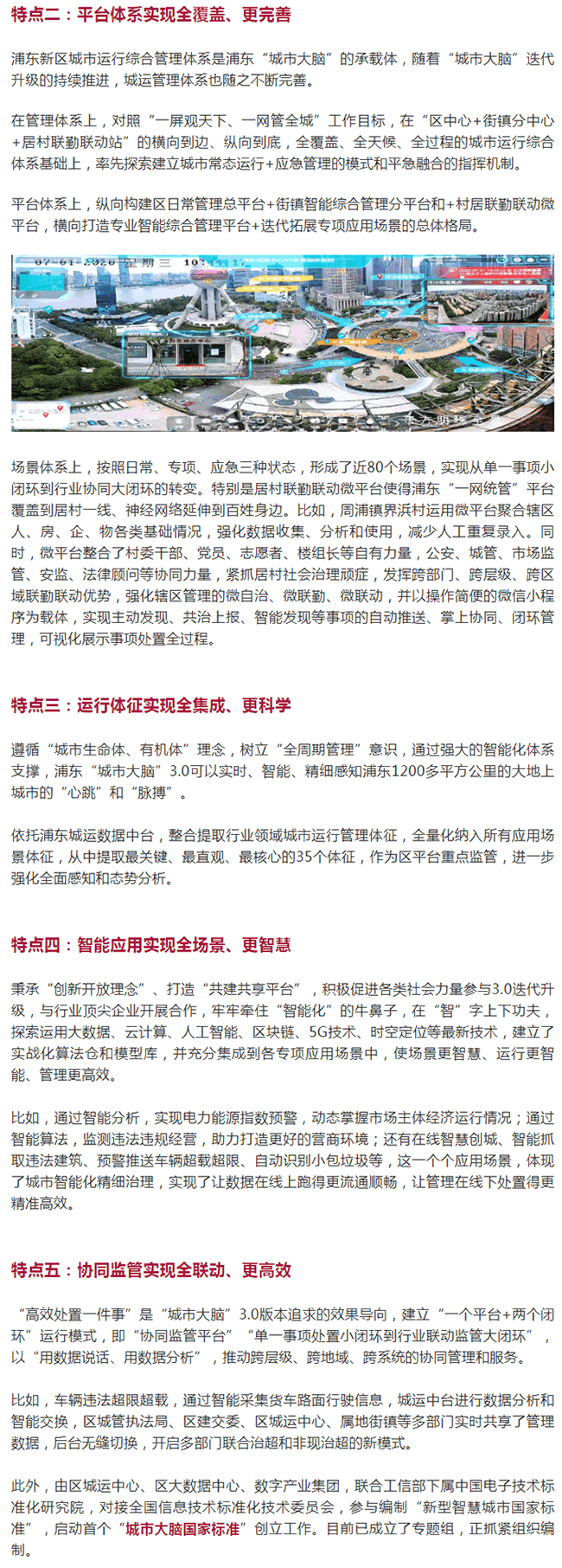 浦東“城市大腦”3.0版本,堅(jiān)持從群眾需求和城市治理突出問(wèn)題出發(fā),緊扣市“一網(wǎng)通辦、一網(wǎng)統(tǒng)管”建設(shè)推進(jìn)大會(huì)以及十一屆市委九次全會(huì)精神,始終把人民對(duì)美好生活的向往作為奮斗目標(biāo),將“人民城市人民建,人民城市為人民”重要理念落實(shí)到建設(shè)運(yùn)行的全過(guò)程和各L域,以智能化為突破口,全方位整合城市運(yùn)行管理力量,全鏈條貫通城市運(yùn)行管理體系,全覆蓋構(gòu)建智能監(jiān)管應(yīng)用場(chǎng)景,全要素建立協(xié)同G效監(jiān)管模式,努力實(shí)現(xiàn)城市治理亂點(diǎn)趨零、安全生產(chǎn)隱患趨零、綜合管理應(yīng)急歸零。3.0版本在治理要素、平臺(tái)體系、運(yùn)行體征、智能應(yīng)用、協(xié)同監(jiān)管上體現(xiàn)了五大提升,打造更精細(xì)、更完善、更科學(xué)、更智慧、更G效的“一張網(wǎng)”。