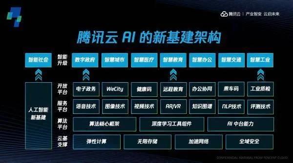 基于騰訊云、企業(yè)微信等社交連接工具,騰訊布局AI新基建全景。騰訊云AI新基建整體布局為“一云三平臺(tái)”架構(gòu)。一云是騰訊云,三平臺(tái)包括算法平臺(tái)、服務(wù)平臺(tái)以及開(kāi)放平臺(tái)。