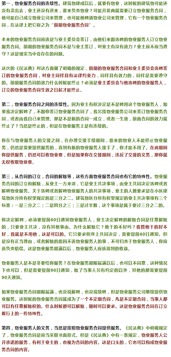 物業(yè)服務(wù)合同跟其他提供勞務(wù)類的合同區(qū)別在哪?物業(yè)服務(wù)提供的勞務(wù)具有多樣性、復(fù)雜性和多元性。物業(yè)服務(wù)的服務(wù)提供太多了,既包括建筑物及其附屬設(shè)施的維護和維修,又包括環(huán)境衛(wèi)生的維護和管理,還包括生活秩序等等一些維護和管理,它的服務(wù)是非常廣闊的。在整個小區(qū)內(nèi),小區(qū)的一些事務(wù)的管理基本上是由物業(yè)服務(wù)公司的人來負(fù)責(zé)管理。物業(yè)服務(wù)合同中有以下幾個問題需要重視: