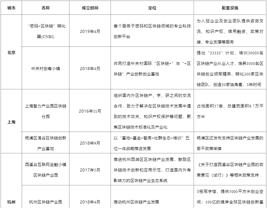 中關(guān)村創(chuàng)客小鎮(zhèn) 楊浦區(qū)灣谷區(qū)塊鏈創(chuàng)新產(chǎn)業(yè)基地 西溪谷互聯(lián)網(wǎng)金融小鎮(zhèn)區(qū)塊鏈產(chǎn)業(yè)園 杭州區(qū)塊鏈產(chǎn)業(yè)園 蟻米區(qū)塊鏈眾創(chuàng)空間 廣州區(qū)塊鏈國(guó)際創(chuàng)新中心