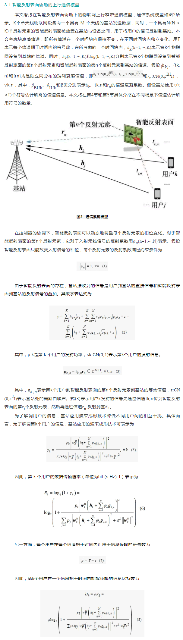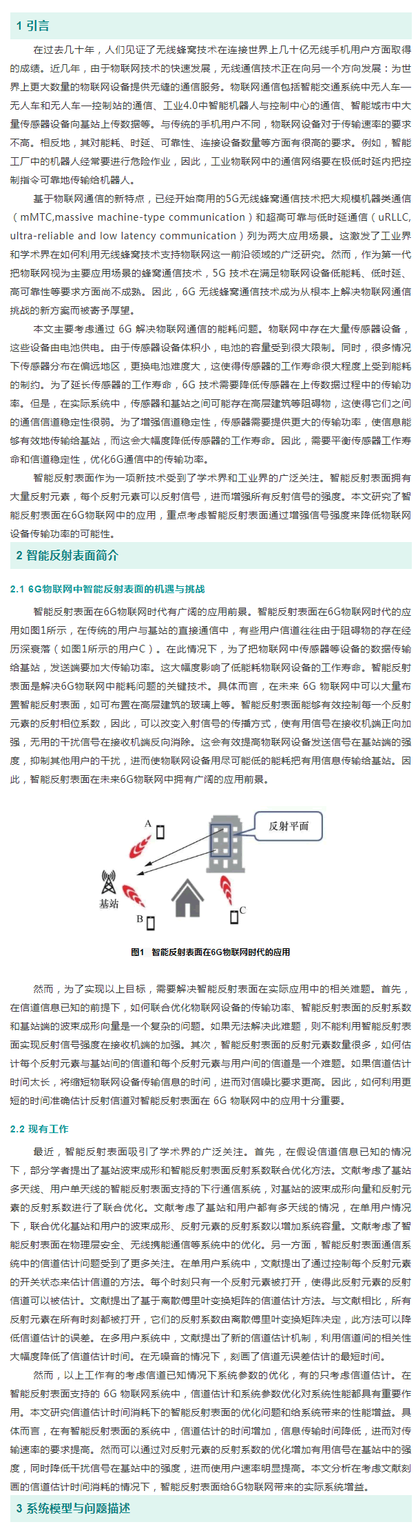 在未來6G無線蜂窩通信網(wǎng)絡(luò)中,基站需要為分布在各個角落的海量物聯(lián)網(wǎng)設(shè)備提供無縫連接。受限于位置因素,很多物聯(lián)網(wǎng)設(shè)備與基站之間的通信鏈路由于障礙物的阻擋變得不可靠,這對于在6G時代實現(xiàn)物聯(lián)網(wǎng)萬物互聯(lián)是一大阻礙。為了解決該難題,分析了在6G物聯(lián)網(wǎng)中使用智能反射表面這一新技術(shù)以增加用戶信號在基站端強(qiáng)度的可能性。具體而言,在考慮信道估計開銷的前提下,聚焦物聯(lián)網(wǎng)設(shè)備上行通信傳輸功率小化問題。一方面,在配備中小規(guī)模天線的基站系統(tǒng)中,提出了迭代算法以聯(lián)合優(yōu)化用戶傳輸功率、智能反射表面反射系數(shù)和基站波束成形。另一方面,在配備大規(guī)模天線的基站系統(tǒng)中,提出了具有閉式表達(dá)式的用戶傳輸功率、智能反射表面反射系數(shù)和基站波束成形設(shè)計以降低其應(yīng)用復(fù)雜度。仿真結(jié)果驗證了智能反射表面在6G物聯(lián)網(wǎng)中增加網(wǎng)絡(luò)連接能力的巨大潛力。