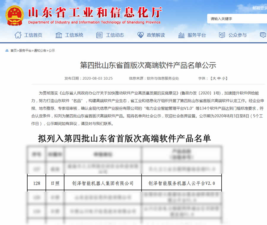 近日,省工業(yè)和信息化廳發(fā)布《山東省首版次G端軟件(第四批)公示名單》,創(chuàng)澤集團自主研發(fā)的“創(chuàng)澤智能服務機器人云平臺V2.0”等軟件產(chǎn)品成功入選。截至目前,創(chuàng)澤集團共有多款產(chǎn)品榮獲山東省首版次G端軟件產(chǎn)品。
