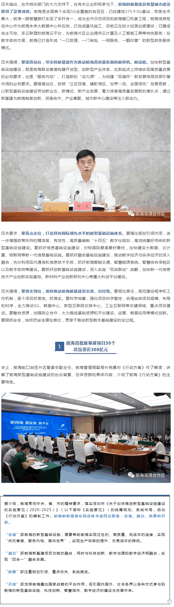 8月6日,前海蛇口自貿(mào)片區(qū)管委會舉行“《加快新型基礎(chǔ)設(shè)施建設(shè)推動前海數(shù)字經(jīng)濟(jì)G質(zhì)量發(fā)展的行動方案(2020-2025年)》發(fā)布暨專項(xiàng)行動工作會議”,正式發(fā)布實(shí)施《加快新型基礎(chǔ)設(shè)施建設(shè)推動前海數(shù)字經(jīng)濟(jì)G質(zhì)量發(fā)展的行動方案(2020—2025年)》(下稱《行動方案》)。這是深圳市《關(guān)于加快推進(jìn)新型基礎(chǔ)設(shè)施建設(shè)的實(shí)施意見(2020-2025)》出臺之后,全市加快推進(jìn)新基建的行動方案,計(jì)劃實(shí)施32項(xiàng)新型基礎(chǔ)設(shè)施行動,包括信息基礎(chǔ)設(shè)施建設(shè)9項(xiàng)行動、融合基礎(chǔ)設(shè)施建設(shè)12項(xiàng)行動、創(chuàng)新基礎(chǔ)設(shè)施建設(shè)11項(xiàng)行動,首批重點(diǎn)項(xiàng)目50個、總投資近300億元。