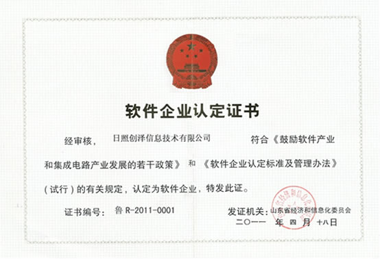 日照創(chuàng)澤信息技術(shù)有限公司于二零一一年四月十八日通過(guò)山東省經(jīng)濟(jì)和信息化委員化審核,符合《鼓勵(lì)軟件產(chǎn)業(yè)和集成電路產(chǎn)業(yè)發(fā)展的若干政策》和《軟件企業(yè)認(rèn)定標(biāo)準(zhǔn)和管理辦法》有關(guān)規(guī)定,被認(rèn)定為軟件企業(yè)。 頒發(fā)《軟件企業(yè)認(rèn)定證書(shū)》,證書(shū)編號(hào):魯R-2011-0001 ![]() |