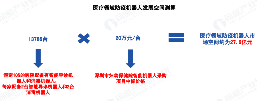 根據(jù)國(guó)家衛(wèi)計(jì)委數(shù)據(jù),截至2020年4月份,我國(guó)共有34464家醫(yī)院,假定10%的醫(yī)院配備智能導(dǎo)診和消毒機(jī)器人,每家配備2臺(tái)智能導(dǎo)診機(jī)器人和2臺(tái)消毒殺菌機(jī)器人,對(duì)應(yīng)的市場(chǎng)需求約為13786臺(tái)。參照深圳市婦幼保健院的智能導(dǎo)機(jī)器人采購(gòu)項(xiàng)目的中標(biāo)價(jià)格,按照單價(jià)20萬(wàn)元計(jì)算,對(duì)應(yīng)的市場(chǎng)空間約為27.6億元。
