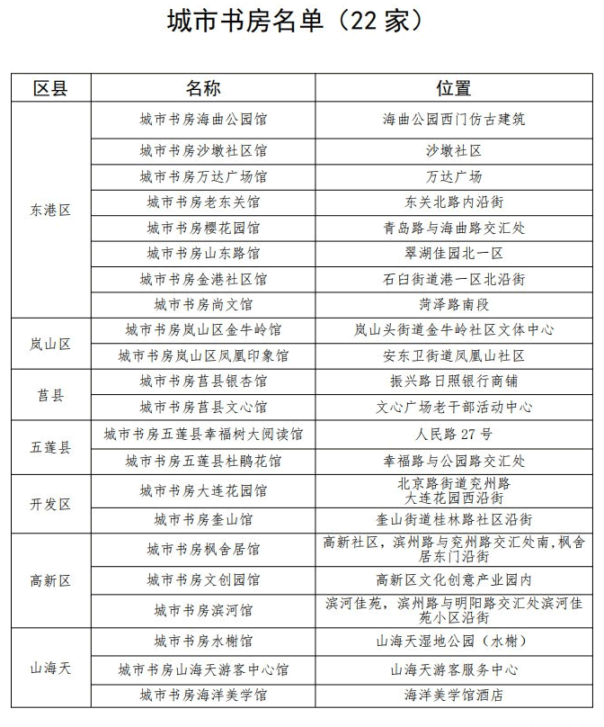 環(huán)衛(wèi)所城市書(shū)房(環(huán)翠路南段,興業(yè)新?tīng)I(yíng)華府西門(mén)) 運(yùn)總集團(tuán)城市書(shū)房(黃海二路11號(hào)) 石臼街道城市書(shū)房(黃海一路與海濱五路交匯處) 開(kāi)發(fā)區(qū)中心公園城市書(shū)房(天津路72號(hào))