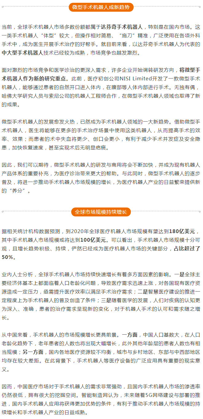 傳統(tǒng)的手術(shù)方式存在著準(zhǔn)確度、耗費(fèi)時(shí)長、視野角度等多方面問題,而手術(shù)機(jī)器人的應(yīng)用可以很好地解決上述難點(diǎn)。通過手術(shù)機(jī)器人來輔助進(jìn)行手術(shù),具有準(zhǔn)確度G、出血量少、創(chuàng)傷面小、恢復(fù)速度快等優(yōu)勢,得到了醫(yī)生、患者