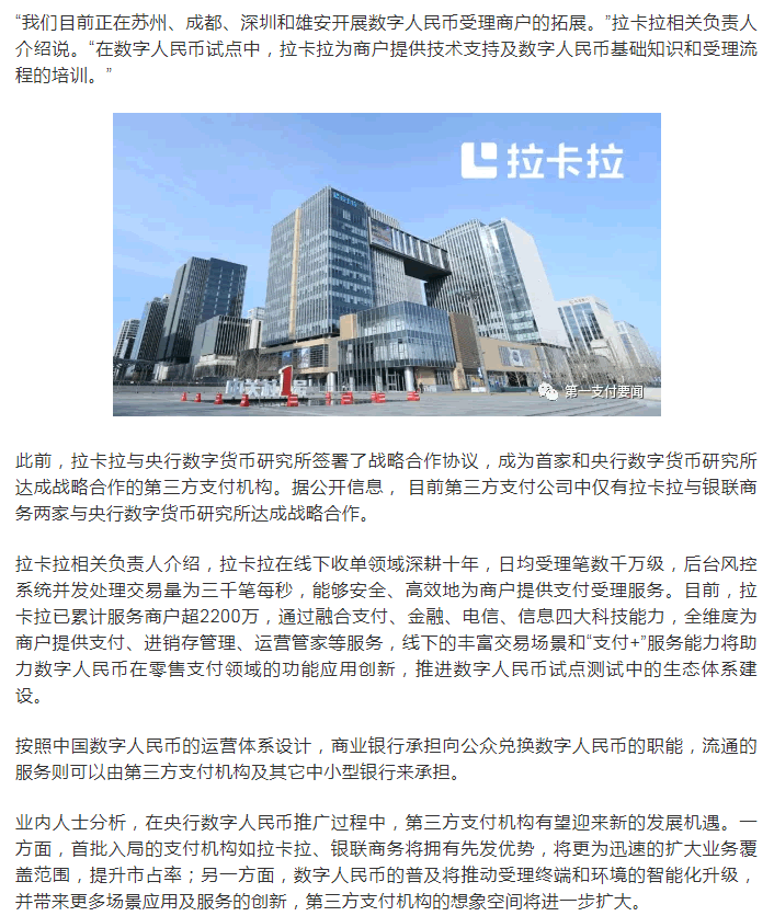 據(jù)了解,作為首家開通數(shù)字人民幣受理服務(wù)的支付機(jī)構(gòu),此次拉卡拉參與蘇州雙十二活動(dòng)的商戶門店數(shù)近千家,包括全國(guó)知名連鎖藥店,商超,化妝品店,餐飲店,酒店,連鎖美甲店,汽配店等。此次蘇州數(shù)字人民幣消費(fèi)紅包測(cè)試支持掃一掃、碰一碰(雙離線)等非接觸支付方式。