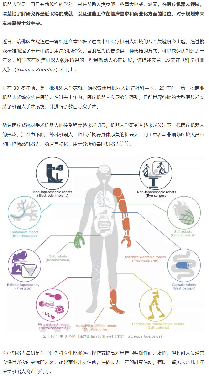 研究人員通過(guò)搜索 2010-2020 年期間《科學(xué)》雜志上被引用多的醫(yī)療機(jī)器人論文,確定了八個(gè)熱門(mén)研究主題,包括機(jī)器人腹腔鏡、用于微創(chuàng)手術(shù)的非腹腔鏡機(jī)器人、輔助穿戴式機(jī)器人、治療康復(fù)機(jī)器人、膠囊機(jī)器人、磁驅(qū)動(dòng)、軟體機(jī)器人和連續(xù)體機(jī)器人等。