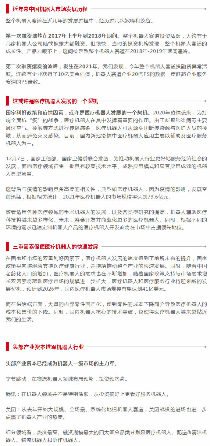 據(jù)相關數(shù)據(jù)統(tǒng)計,2021年前11個月,316家機器人項目獲得融資,總金額超330.5億元,全年將達360億元,平均每筆融資超億元。今年以來,協(xié)作、手術、倉儲、服務、清潔、工業(yè)等各品類的醫(yī)療機器人百花齊放,各企業(yè)爭相投資經(jīng)常機器人行業(yè)。醫(yī)療機器人是什么?它有什么分類呢?