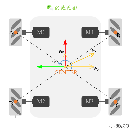 要滿足上述的分力能夠相互抵消的條件是麥輪(或電機)轉(zhuǎn)速大小相同,因為每個麥輪受到的地面支持力相同(基于假設(shè)①②),4個電機又勻速等速轉(zhuǎn)動,意味著電機輸出扭矩與地面作用于麥輪的摩擦力是平衡的,4個麥輪摩擦力在輪轂軸向和徑向上分解的大小是相同的,而速度分解與力分解類似,所以4個麥輪沿輪轂軸向和徑向的分速度大小是相同的。