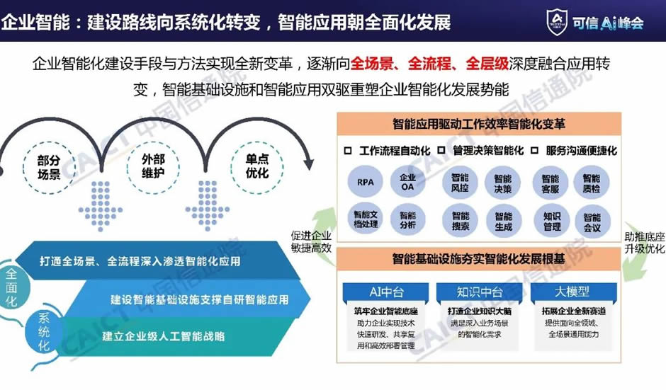 企業(yè)智能化建設(shè)手段與方法實(shí)現(xiàn)全新變革,逐漸向全場(chǎng)景、全流程、全層級(jí)深度融合應(yīng)用轉(zhuǎn)變。隨著智能化技術(shù)的不斷發(fā)展和應(yīng)用深入,企業(yè)智能建設(shè)從部分場(chǎng)景、外部維護(hù)、單點(diǎn)優(yōu)化逐漸向系統(tǒng)化、多面化轉(zhuǎn)變,通過智能基礎(chǔ)設(shè)施和智能應(yīng)用雙驅(qū)重塑企業(yè)智能化發(fā)展勢(shì)能。