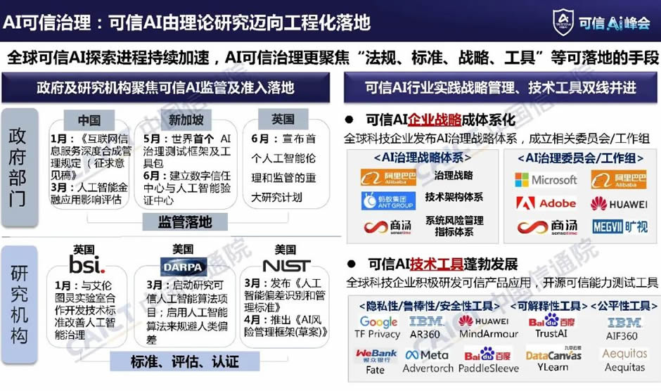 可信AI由理論研究邁向工程化落地。隨著人工智能技術(shù)的快速發(fā)展,社會(huì)各界對可信AI研究已經(jīng)從理論探索逐步走向工程化落地實(shí)踐。政府與研究機(jī)構(gòu)相關(guān)政策和規(guī)范從宏觀指導(dǎo),開始向可操作、可落地的規(guī)范演進(jìn)。在法律監(jiān)管層面,各政府部門的法規(guī)政策愈發(fā)重視實(shí)施和操作。例如新加坡于5月出臺世界AI治理測試框架及工具包;英國6月宣布人工智能倫理和監(jiān)管的重大研究計(jì)劃。