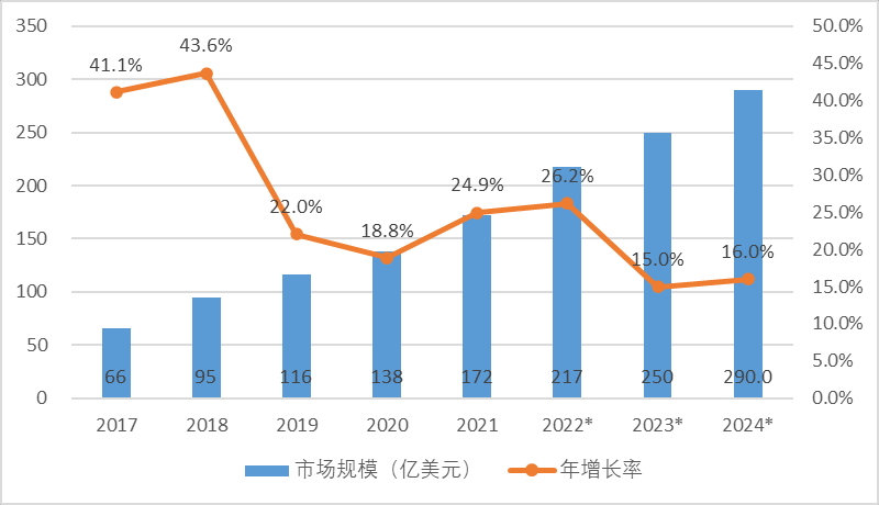 預(yù)計(jì) 2022 年, 服務(wù)機(jī)器人市場規(guī)模達(dá)到 217 億美元。 2024 年, 全 球服務(wù)機(jī)器人市場規(guī)模將有望增長到 290 億美元。