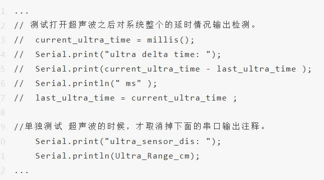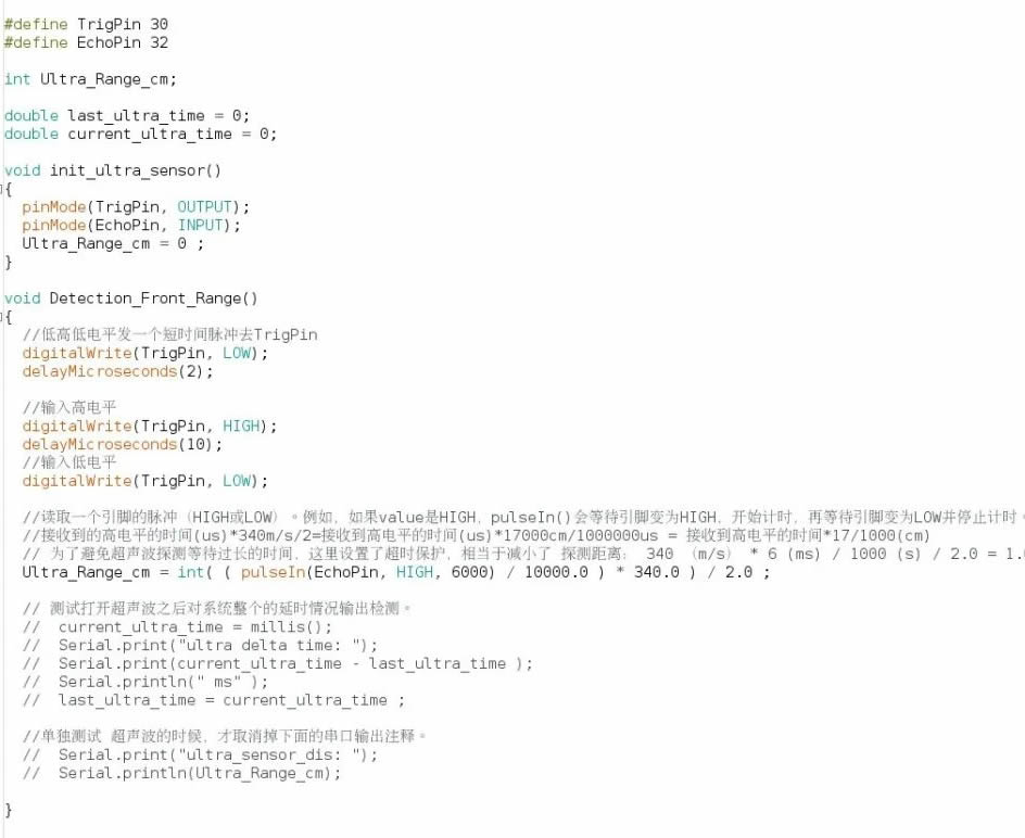 該程序定義了一個存儲測距信息的變量 Ultra_Range_cm , 測距范圍為“0-1m”。此時,我們可以看見下面有兩大段注釋。其中,D一段是用來測試整個系統功能執(zhí)行一遍所需要的時間,若取消掉注釋,即可在 串口監(jiān)視器 實時查看輸出的時間信息。