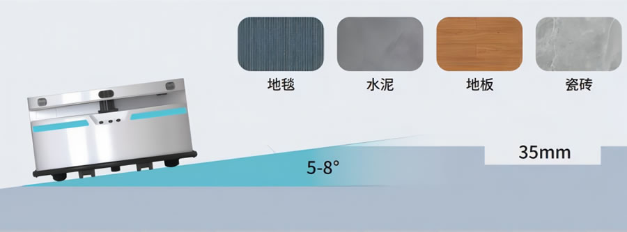 作為底盤界新星,創(chuàng)澤通用智能機器人底盤在負重、越障、爬坡性能方面同樣也表現(xiàn)優(yōu)異。除了在平地上擁有穩(wěn)定可靠的導(dǎo)航避障性能,在面對坡度、過坎這些障礙物時,也擁有穩(wěn)定的行走性能,可以廣泛適用于地板、地毯、瓷磚、水泥等多種材質(zhì)地面,滿足J大部分場景應(yīng)用。