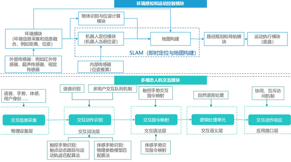 環(huán)境感知與導(dǎo)航是指機(jī)器人通過傳感器獲取外界環(huán)境及自身信息;運(yùn)動控制器是服務(wù)機(jī)器人行動的執(zhí)行者;人機(jī)交互技術(shù)是實(shí)現(xiàn)服務(wù)機(jī)器 人與人溝通的橋梁