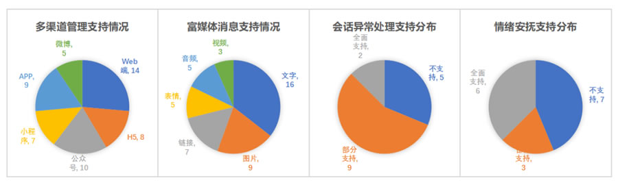 總體而言,參評(píng)產(chǎn)品在多渠道管理支持能力和富媒體消息互動(dòng)支持能力方面表現(xiàn)良好,所有參評(píng)產(chǎn)品均支持兩種及其以上渠道管理,G的支持達(dá)到六種,多面覆蓋了PC端和移動(dòng)端用戶。參評(píng)產(chǎn)品在會(huì)話異常處理上表現(xiàn)比較接近,大部分產(chǎn)品部分支持該功能,在情緒安撫功能支持上兩J化差異較明顯,多面支持和不支持?jǐn)?shù)量相近,兩者合計(jì)數(shù)量占比超過八成。主要有以下三個(gè)方面的特點(diǎn):