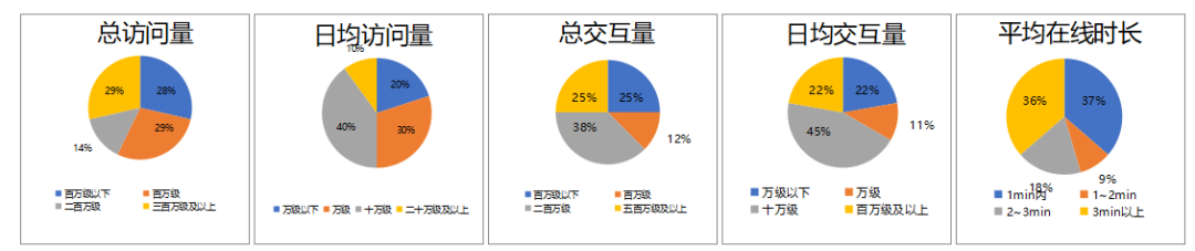 從訪問量上看,超七成產(chǎn)品的總訪問量達(dá)到了百萬級(jí),其中總訪問量超過二百萬和三百萬的產(chǎn)品約占三成;從日均訪問量上看,約70%的產(chǎn)品日均訪問量在一萬到二十萬之間,僅有10%的產(chǎn)品突破了二十萬大關(guān);從交互量上看,約75%的產(chǎn)品總交互量超過了百萬條,約78%的產(chǎn)品日均交互量超過一萬條;從用戶平均在線時(shí)長上來看,超五成產(chǎn)品達(dá)到了2分鐘以上,約37%的產(chǎn)品用戶平均在線時(shí)長不足1分鐘,另外平均在線時(shí)長超過3分鐘的產(chǎn)品數(shù)約占36%。