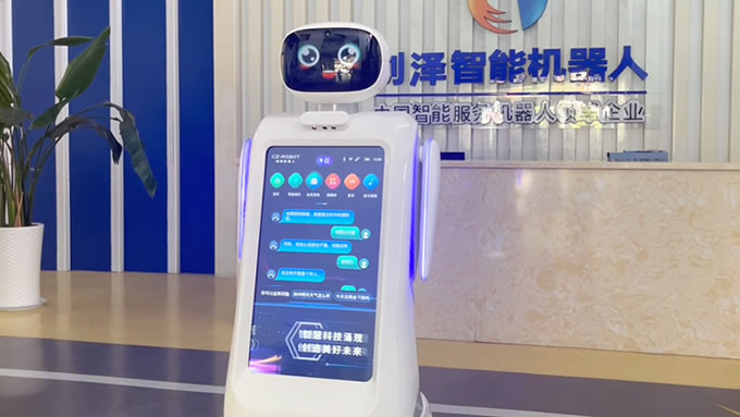 進(jìn)入園區(qū)內(nèi)的展廳,可以遇到一臺(tái)服務(wù)接待機(jī)器人“創(chuàng)創(chuàng)”。