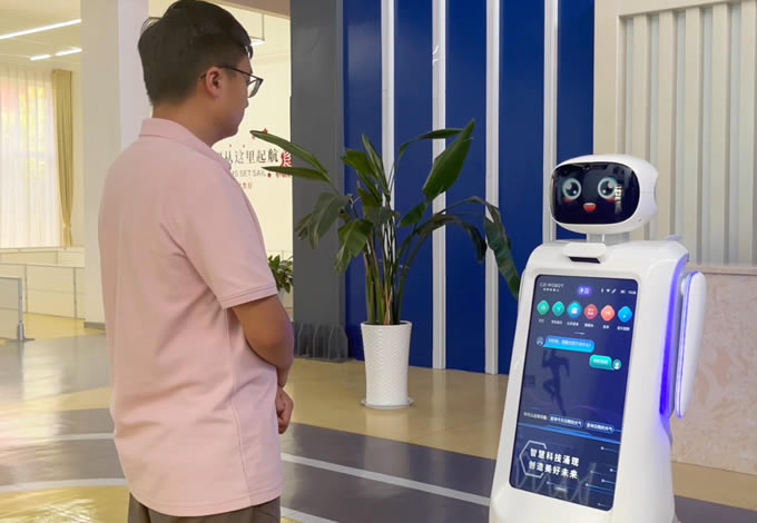 前臺接待機(jī)器人為多種類型的單位(如餐廳,商場,展廳,接待室,機(jī)場,車站,圖書館,學(xué)校等)完成前臺接待工作,按照設(shè)置好的路線提供講解服務(wù),隨時解答訪客提出的相關(guān)問題