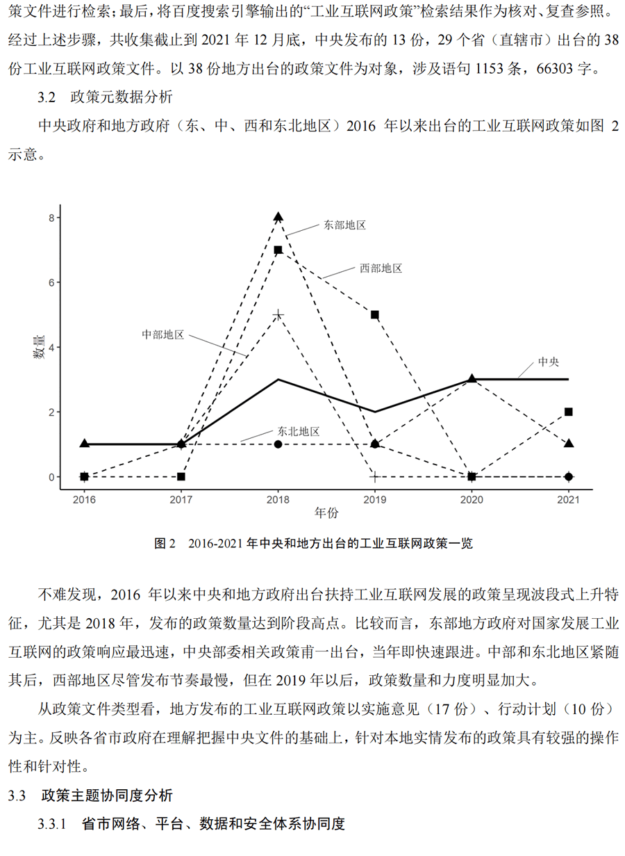 現(xiàn)有研究多圍繞工業(yè)互聯(lián)網(wǎng)架構(gòu)、標(biāo)準(zhǔn)和平臺(tái)體系展開,較少分析地方政府對四大功能體系 建設(shè)的政策導(dǎo)向。本文一方面應(yīng)用協(xié)同度算法評(píng)價(jià)地方政策體系協(xié)同水平,識(shí)別體系協(xié)同短板, 另一方面總結(jié)東、中、西和東北地區(qū)地方政策建設(shè)工業(yè)互聯(lián)網(wǎng)的側(cè)重點(diǎn)差異。
