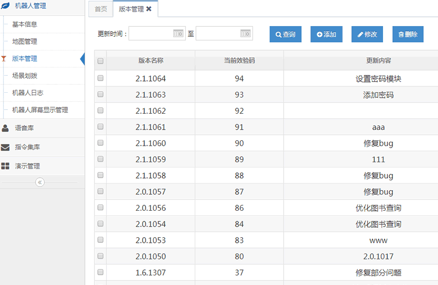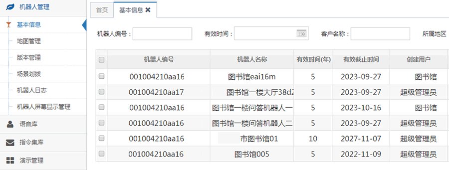 迎賓機(jī)器人管理的功能是對(duì)用戶(hù)使用的機(jī)器人信息進(jìn)行管理,包括機(jī)器人基本屬性的配置,以及相關(guān)信息的常規(guī)操作,增刪改查等功能。
