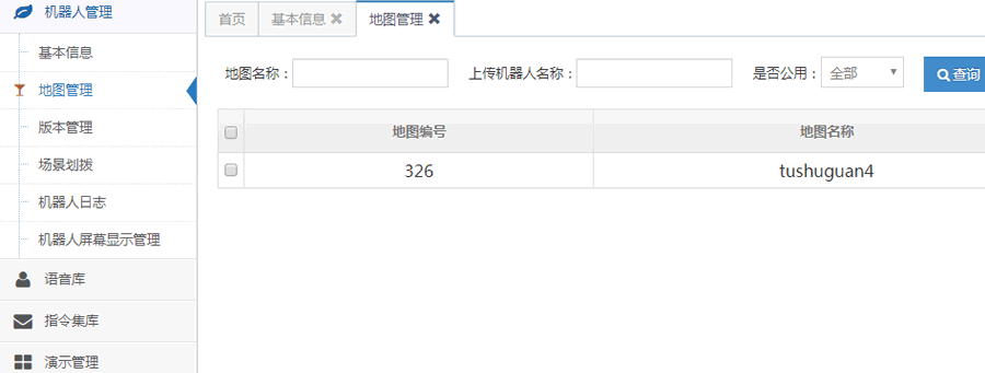 地圖管理模塊是對(duì)機(jī)器人地圖庫(kù)及對(duì)應(yīng)地圖和記錄點(diǎn)的查看,包括地圖名稱(chēng),對(duì)應(yīng)的機(jī)器人名稱(chēng)和更新時(shí)間等內(nèi)容。