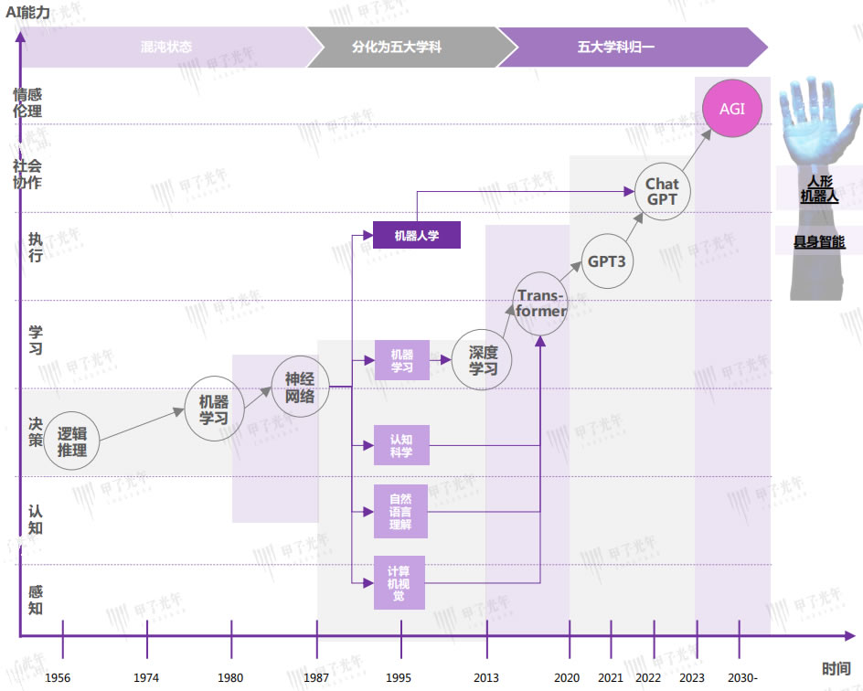 憑借機(jī)器視覺,自然語言理解等人工智能技術(shù)的發(fā)展,初代“AI+”機(jī)器人產(chǎn)品逐步成熟,生成式AI的爆發(fā)與通用人工智能的曙光