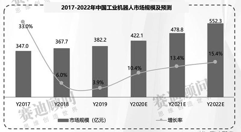2019年,工業(yè)機(jī)器人市場(chǎng)規(guī)模受下游汽車、電子電氣等行業(yè)景氣度下滑的影響,增速較上年放緩,呈現(xiàn)下降趨勢(shì),但總體市場(chǎng)規(guī)模仍然呈現(xiàn)穩(wěn)定上升趨勢(shì),達(dá)382.2億元,預(yù)計(jì)到2022年,工業(yè)機(jī)器人市場(chǎng)規(guī)模將進(jìn)一步增長(zhǎng),達(dá)到552.3億元 。