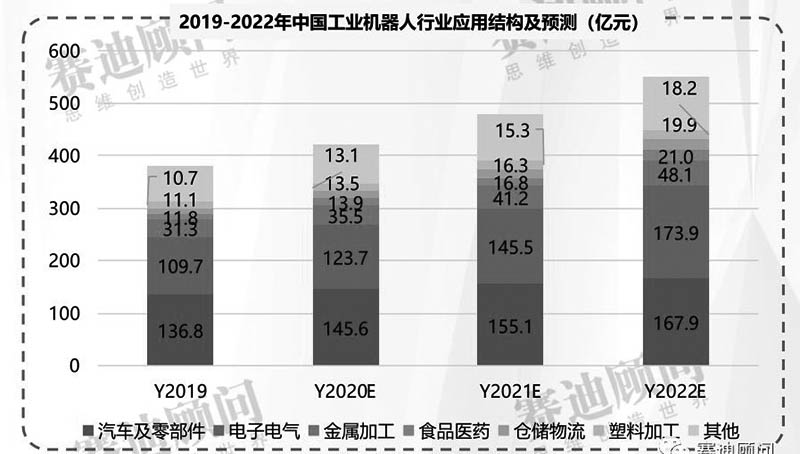 未來(lái)三年,工業(yè)機(jī)器人行業(yè)應(yīng)用結(jié)構(gòu)的總體格局基本保持不變。到2022年,汽車及零部件、電子電氣仍然占據(jù)大比重,隨著制造業(yè)轉(zhuǎn)型升級(jí)進(jìn)程的不斷加速,將為金屬加工、食品醫(yī)藥、倉(cāng)儲(chǔ)物流等應(yīng)用行業(yè)帶來(lái)更大的市場(chǎng)空間。